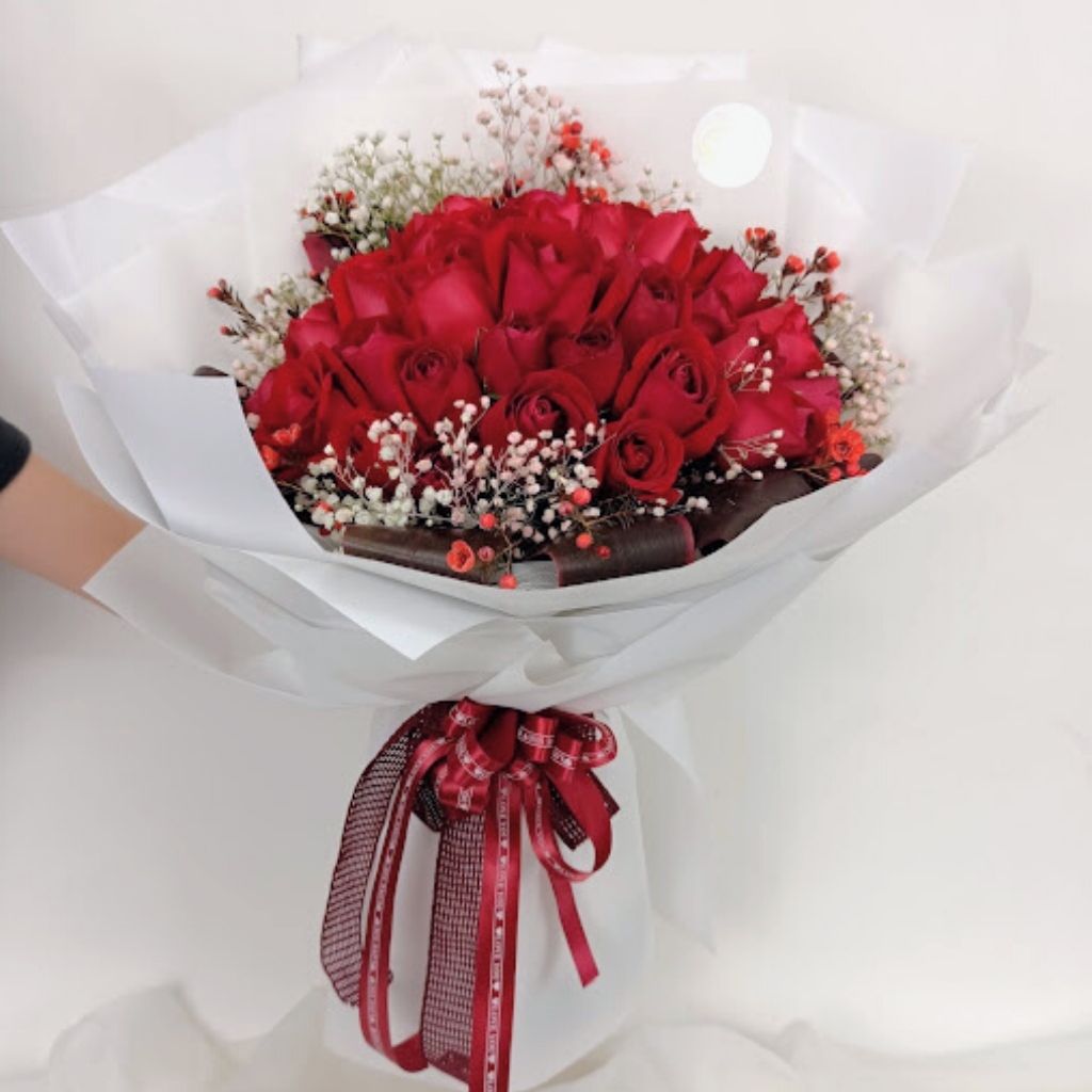 Heavenly love Red Roses in midst of Baby Breath, Berry and Wax Flower.
